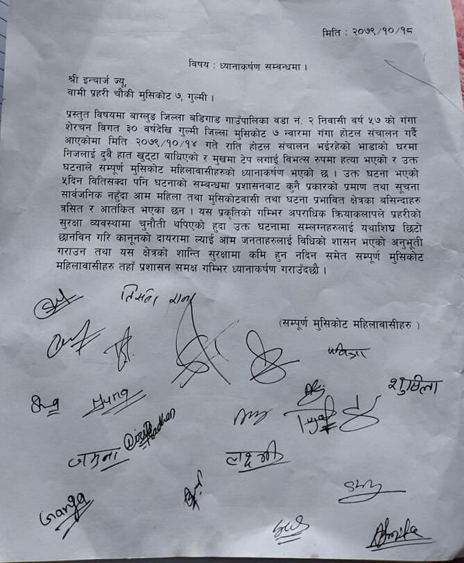 मुसिकोटमा रहेका महिलाहरुद्धारा हस्ताक्षरित ध्यानाकर्षण पत्रमा यस प्रकारको गम्भीर अपराधिक क्रियाकलापले प्रहरीको सुरक्षा व्यवस्थामा चुनौती थपेको भन्दै यस क्षेत्रको शान्ति सुरक्षामा कमी हुन नदिन आग्रह गरेको छ।