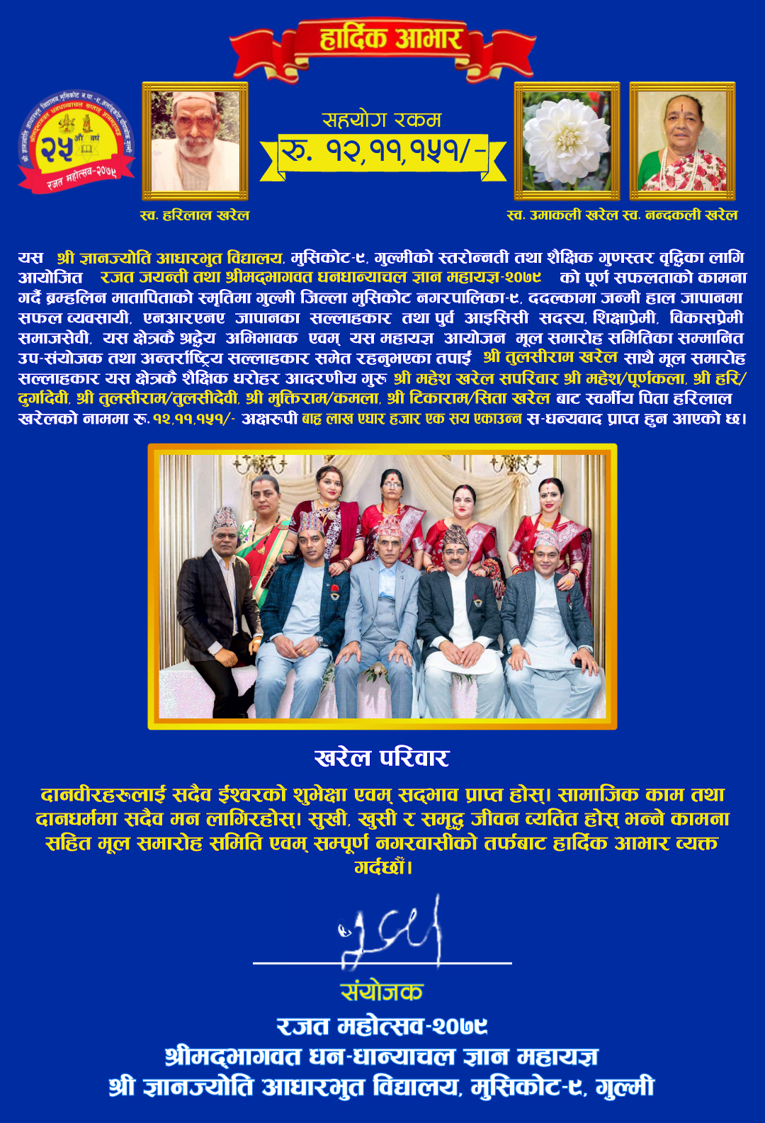 गुल्मी मुसिकोट नगरपालिका-९, अर्लाङ्कोट स्थित ज्ञानज्योति आधारभुत विद्यालयले आयोजना गरेको यहि मिति २०७९ फाल्गुन ०९-१५ गतेसम्म सञ्चालन गरिने विद्यालयको रजत जयन्ती महोत्सव तथा सप्ताह धनधान्याचल ज्ञान महायज्ञको अवसर पारेर मुसिकोट नगरपालिका-९, ददल्कामा जन्मेर व्यवसायको क्रममा लामो समय देखि जापानमा रहेका, एनआरएनए जापानका सल्लाहकार, पुर्व आइसिसी सदस्य, ददल्का माविका संस्थापक आजीवन सदस्य, अर्लाङ्कोट सेवा समाज जापानका संरक्षक एवम् ज्ञानज्योति आधारभुत विद्यालयको रजत महोत्सव मुल समारोह समितिका उप-संयोजक तथा अन्तर्राष्ट्रिय सल्लाहकार समेत रहेका धर्मधुरन्दर शिक्षाप्रेमी, सफल व्यवसायी, सके सम्म आफ्नो माटोका बेरोजगार युवाहरुलाई नै प्राथमिकतामा राखेर रोजगार दिदै आएका, उच्चकोटिका समाजसेवी, दानवीर श्री तुलसीराम खरेल एवम् उहाँका उन्नत समाजसेवी, दानी चित्तका, शिक्षा प्रेमी, ग्रामप्रेमी सहोदर दाजुभाइको सिंगो परिवारले ब्रह्मलिन पिता हरिलाल खरेलको नाममा रु.१२१११५१ विद्यालयलाई दान गरेको छ।