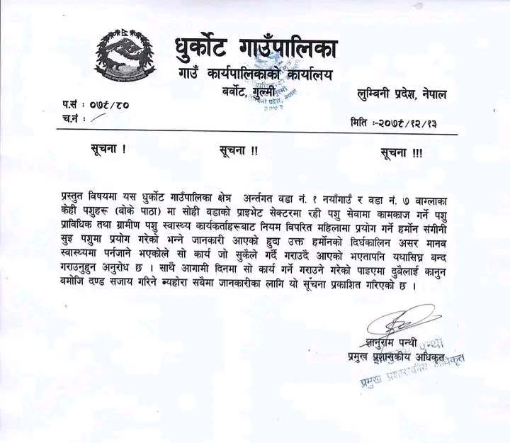 गाउँपालिकाले भने तीन महिने संगिनी सुइ हर्मोनल साधन भएकोले मानव शरीरमा दीर्घकालीन असर पर्न जाने भन्दै पशुमा यो सुइ प्रयोग नगर्न सूचना नै जारी गरेको छ।