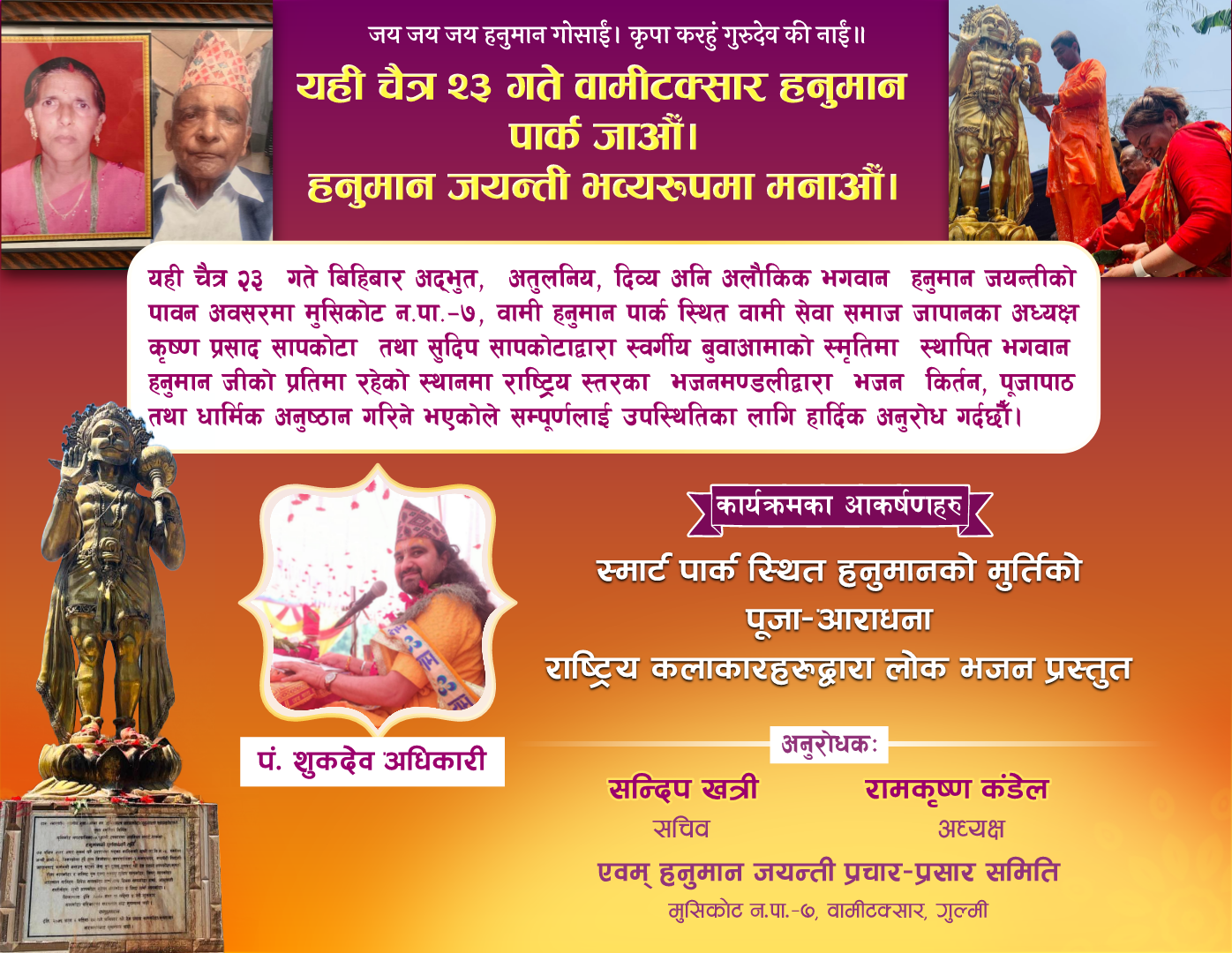 वामी सेवा समिति जापानका अध्यक्ष कृष्ण प्रसाद सापकोटा तथा सुदिप सापकोटाद्धारा स्व.बुबा आमाको स्मृतिमा एकल खर्चमा स्थापित भगवान हनुमान जीको प्रतिमा रहेको स्थानमा धार्मिक अनुष्ठान सहितका विविध कार्यक्रम आयोजना गरिएकाले सम्पूर्णलाई उपस्थित हुन मूल समिति सचिव सन्दिप खत्रीले आग्रह गर्नुभयो । यस क्षेत्रकै ऐतिहासिक कार्यक्रम रहेकाले अहिले प्रचार प्रसारसगैं विभिन्न उपसमितिहरु निर्माण गरेर तैयारी तीब्र रुपमा अगाडी बढाईएको उहाँको भनाई छ।