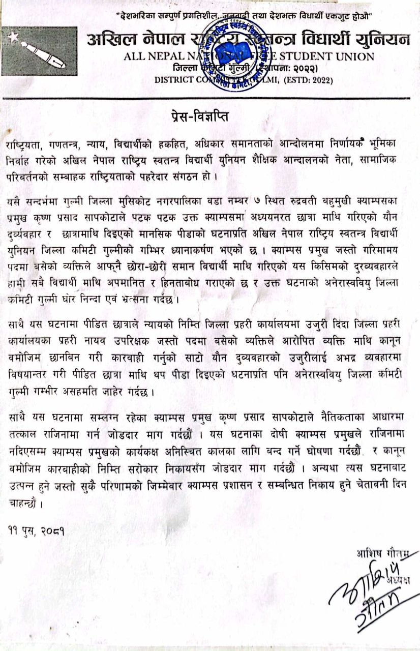 अनेरास्वयुवियुका जिल्ला अध्यक्ष आशिष गौतमद्धारा बिहिबार जारि बिज्ञप्तीमा लेखिएको छ –‘ गुल्मी जिल्ला मुसिकोट नगरपालिका वडा नम्वर ७ स्थित रुद्रवाती बहुमुखी क्याम्पसका प्रमुख कृष्णप्रसाद सापकोटाको पटक पटक उक्त क्याम्पसमा अध्यानरत छात्रा माथी गरिएको यौन दुव्र्यवहार र छात्रा माथी दिईएको मानसिक पिडाको घटना प्रति अखिर नेपाल राष्ट्रिय स्वतन्त्र विद्यार्थी युनियन जिल्ला कमिटी गुल्मीको गम्भीर ध्यानाकषर्ण भएको छ ।