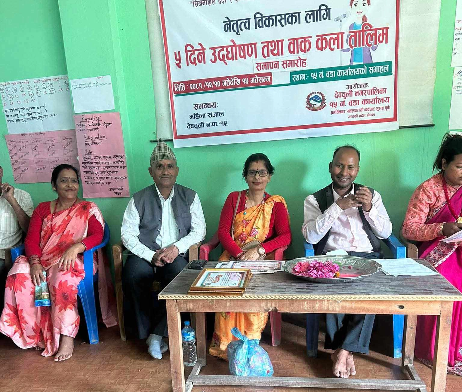 देवचुली  नगरपालिका वडा नं-१५ को आयोजनामा सम्पन्न भएको  यस कार्यक्रममा महिलाहरुलाई लक्षित गरी  ५ दिने उद्घोषण तथा  वाक कला तालिम  कार्यक्रम आयोजना गरेको हो । कार्यक्रमका प्रमुख  अतिथि देवचुली नगरपालिका १५ का वडा अध्यक्ष सुरेश कुमार रानाभाटको प्रमुख   आतिथ्यतामा सम्पन्न भएको छ । महिला हरुलाई दक्ष र क्षमतावान बनाउन को  लागि कार्यक्रमलाई समुहगत बिभाजन गरिएको सो कार्यक्रम मा ३० जना महिलाहरु सहभागी थिए।