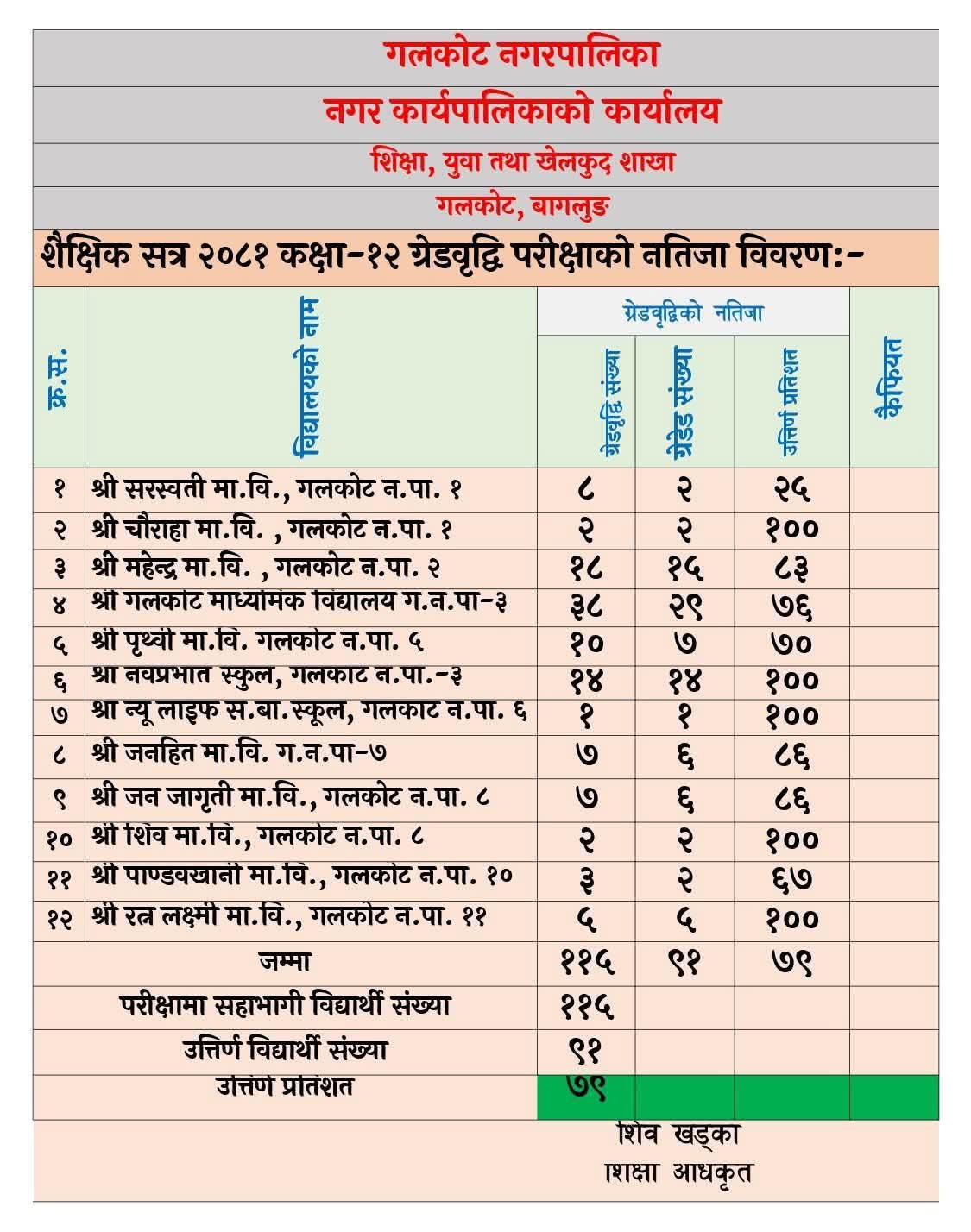 गलकोट, बागलुङ: नगरका कक्षा–१२ सञ्चालन भइरहेका १२ वटा विद्यालयहरूबाट ग्रेडवृद्धि परीक्षामा सहभागी ११५ जनामध्ये ९१ जना उत्तीर्ण भई ७९ प्रतिशत सफलता प्राप्त भएको छ। नियमित तथा ग्रेडवृद्धि दुवै समेट्दा यस वर्ष कक्षा–१२ को कुल नतिजा झन्डै ८४ प्रतिशत कायम भएको छ।