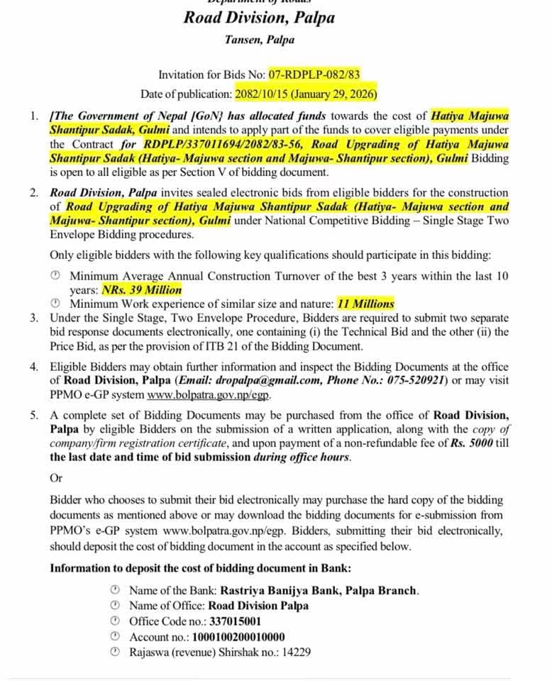 गुल्मी: सडक डिभिजन कार्यालय पाल्पाले गुल्मीको हटिया–मजुवा–शान्तिपुर सडकको स्तर वृद्धिका लागि करिब तीन करोड बराबरको ठेक्का आह्वान गरेको छ।