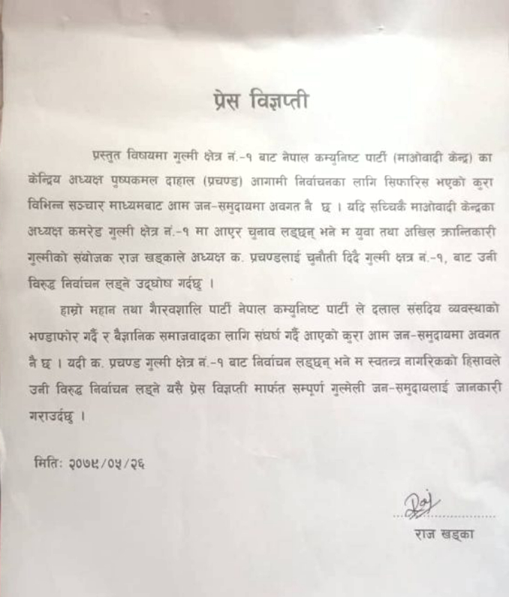 यस्तै पछिल्लो समय नेत्र विक्रम चन्द विप्लवले नेतृत्व गरेको नेकपा निकट अखिल क्रान्तिकारी गुल्मीका संयोजक राज खड्काले प्रचण्ड विरुद्ध चुनाव लडने घोषणा गरेका छन्।