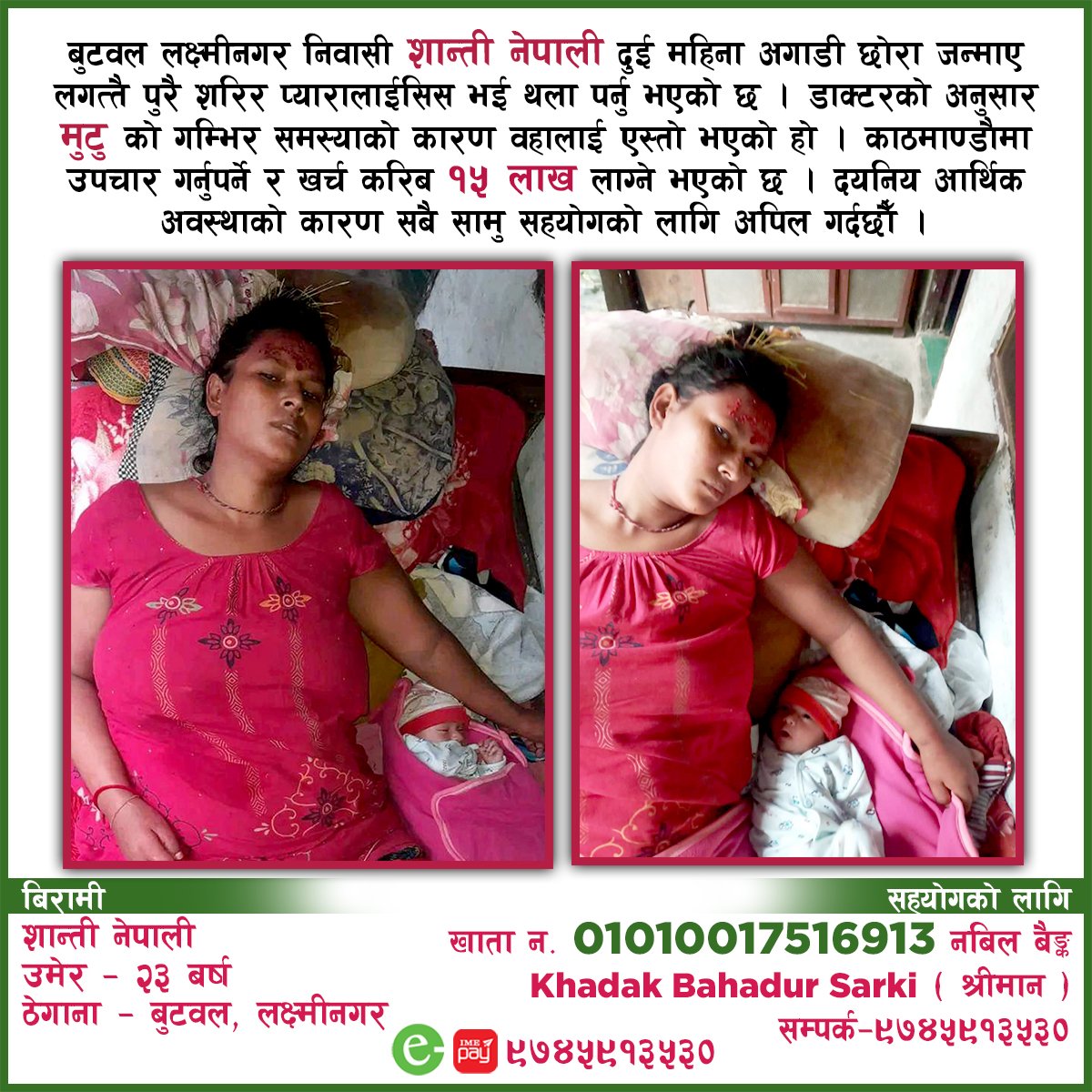 माईती र घर दुवै तिर दयनीय आर्थिक अवस्था भएका उनले न त शान्तिको उपचार गर्न अस्पतालसम्म पुर्याउन सकेका छन् नत २ महिने छोराको राम्रोसगं रेखदेख गर्न नै । शान्ति छोरालाई जन्म दिएदेखि प्यारालाईसिस र मुटु सम्बन्धी रोगले थलिएकी छिन् । उनी २ महिनादेखि बेहोस छिन् । राम्रो अस्पतालमा उपचार गराउने पैसा नभएपछि श्रीमान खड्कले उनलाई घरमै ल्याएर राखेका छन् । उनीहरुको यो अवस्था निकै कारुणीक बनेको छ।
