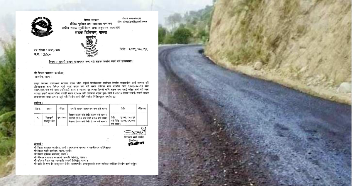पाल्पा-रिडी सडकखण्ड विस्तारका लागि दैनिक १० घण्टा बन्द हुने